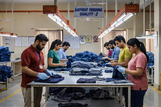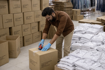 The packing department at Om Regalia ensures that every garment is prepared with care and presented exactly as the buyer requires. Once garments complete the finishing and final quality checks, they move into a structured packing workflow where they are folded or hanger-packed according to client specifications. This includes the organised placement of tags, labels, polybags, size stickers, and any customised packaging elements requested by the buyer.